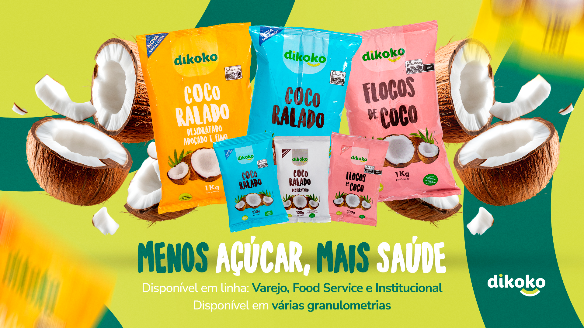 Extraída da película do marrom do coco, a Farinha de Coco Dikoko é uma adição versátil, saudável e prática para receitas salgadas e doces. Naturalmente rica em fibras e sem glúten, a farinha de coco apresenta baixo índice glicêmico e baixo teor de carboidratos. Além de preservar todos os benefícios do coco, ele pode ser usada tanto in natura, com frutas, cereais, granola e vitaminas, quanto no preparo culinário substituindo a farinha de trigo em diversas utilizações de bolos, panquecas, waffles, cookies e pães.